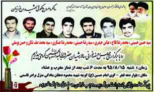 به گزارش دفاع پرس از یزد، مراسم یادبود شهیدان سید حسین حسینی، محمد رضا فلاح، عباس حیدری، سید رضا حسینی، محمد رضا عسگری، سید محمد صف شکن و حسن یوسفی همزمان با مجلس روضه خوانی سرور و سالار شهیدان حضرت ابا عبدالله حسین(ع) از شنبه 95/8/15 به مدت 6 شب بعد از نماز مغرب و عشا در بلوار دهه فجر- کوی امام حسین (ع) کوچه شهید محمود دهقان بنادکی منزل برادر قاسمی برگزار می شود.