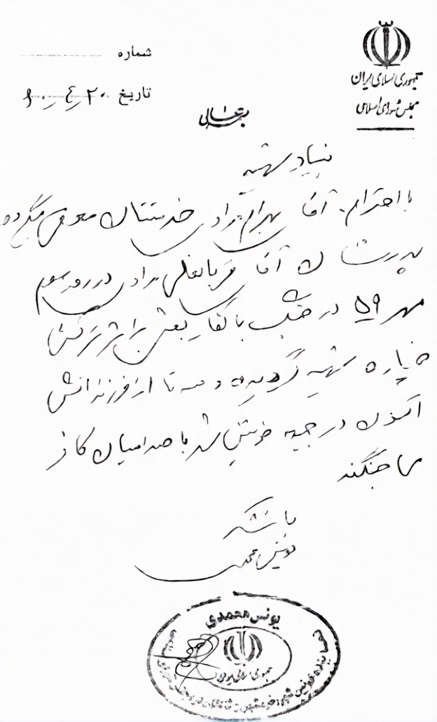 سندی که در ادامه مشاهده میکنید، نامهای مربوط به سال ۱۳۶۰ از سوی «یونس محمدی» نماینده وقت خرمشهر و شادگان در مجلس شورای اسلامی به بنیاد شهید است که در آن «بهرام مرادی» فرزند دیگر این خانواده که او هم در جبههها حضور داشته را بهعنوان فرزند شهید به این بنیاد معرفی کرده است.