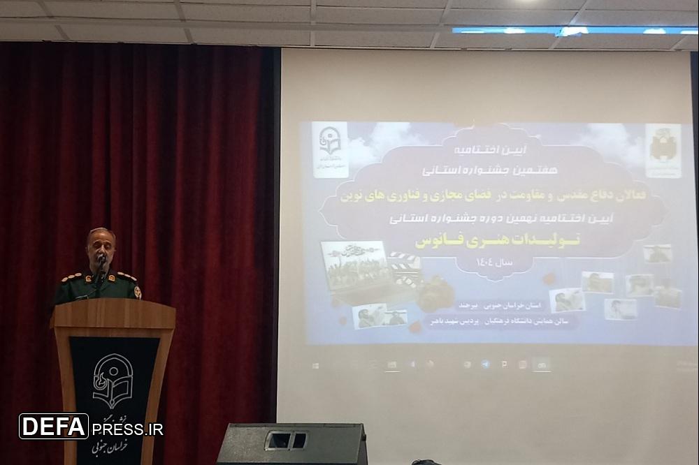در شامگاه امروز ۲۳ مهر آیین اختتامیه هفتمین جشنواره استانی "فعالان دفاع مقدس و مقاومت در فضای مجازی و فناوریهای نوین" و آیین اختتامیه نهمین دوره جشنواره استانی تولیدات هنری فانوس با حضور مدیرکل حفظ آثار و نشر ارزشهای دفاع مقدس و مقاومت خراسان جنوبی در سالن همایش دانشگاه فرهنگیان پردیس شهید باهنر بیرجند برگزار شد.