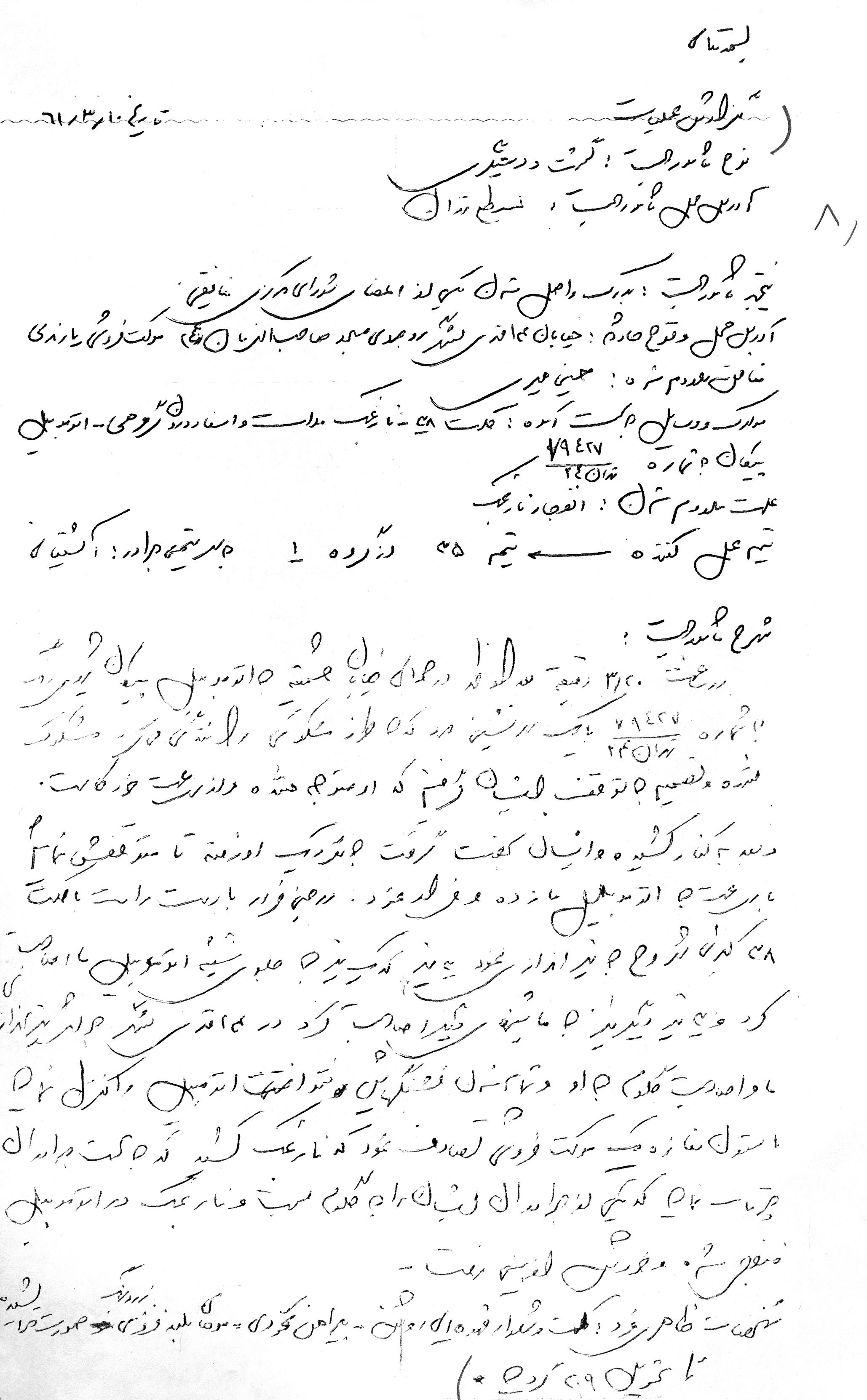 سندی که در ادامه مشاهده میکنید، گزارش یکی از مأموران امنیتی است که حین عملیات گشتزنی، بهطور اتفاقی به خودروی یکی از اعضای شورای مرکزی منافقین بهنام «حسین میری» مشکوک شده و در نتیجه تعقیب و درگیری، این عضو منافقین که بهسمت مأموران تیراندازی کرده بود، با گلوله آنها به هلاکت رسیده است.