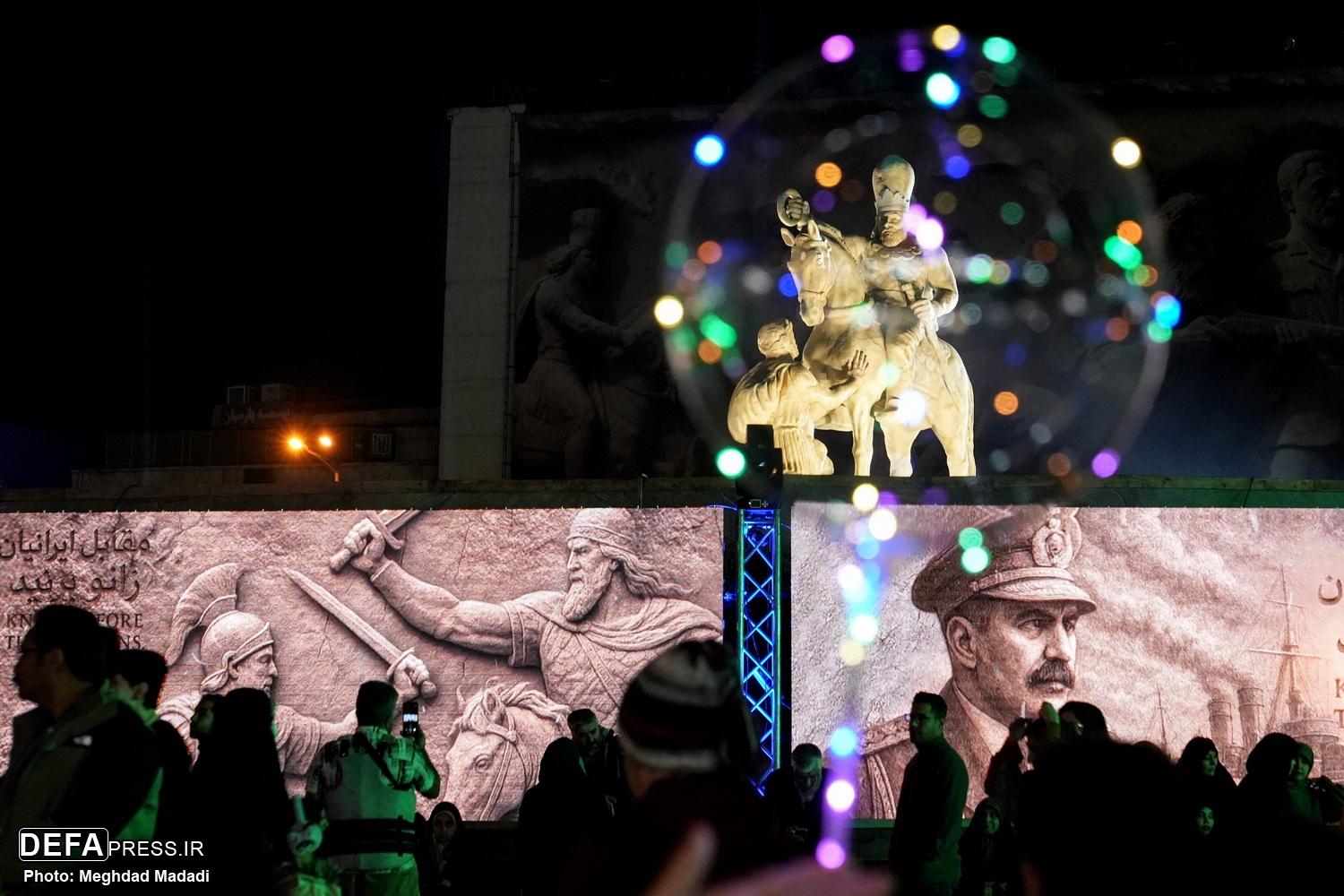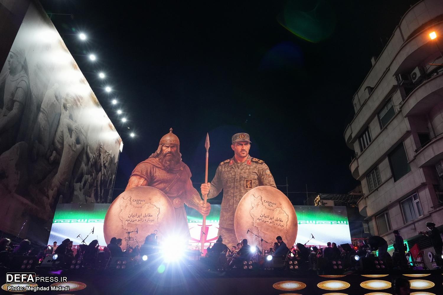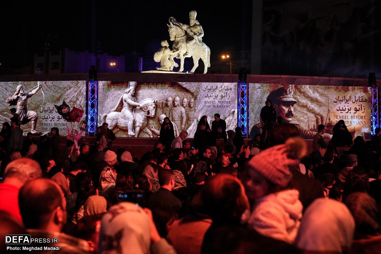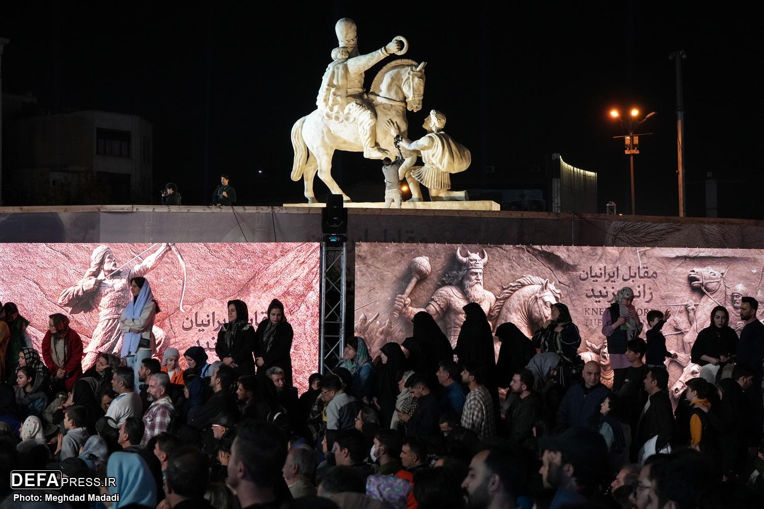 رویداد شب ایران در میدان انقلاب تهران با رونمایی از مجسمه «زانو زدن والرین مقابل پادشاه ایران» و باحضور گسترده اقشار مردم و خواندن سرود «ایایران» برگزارشد.