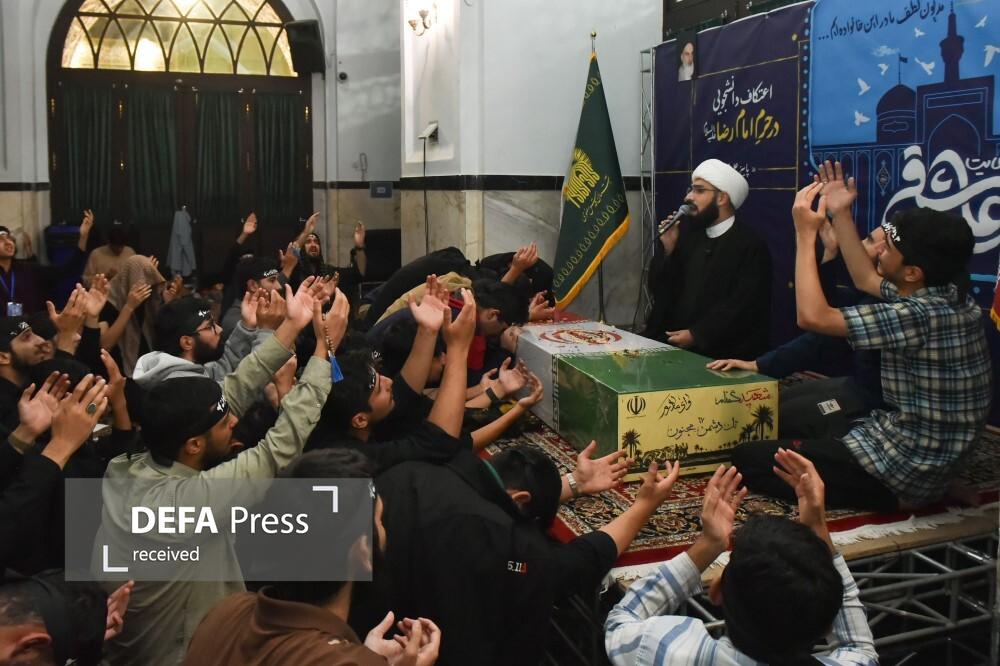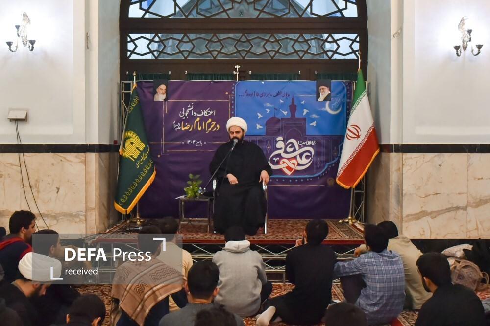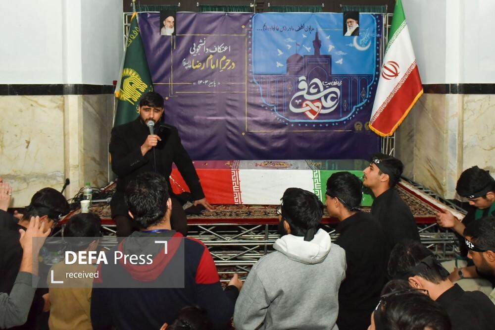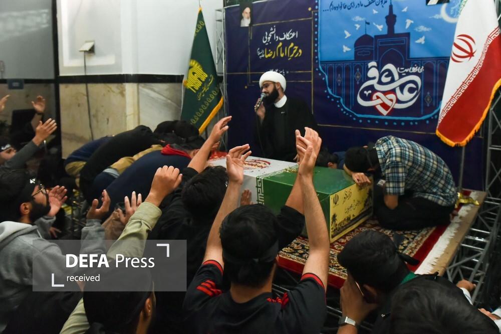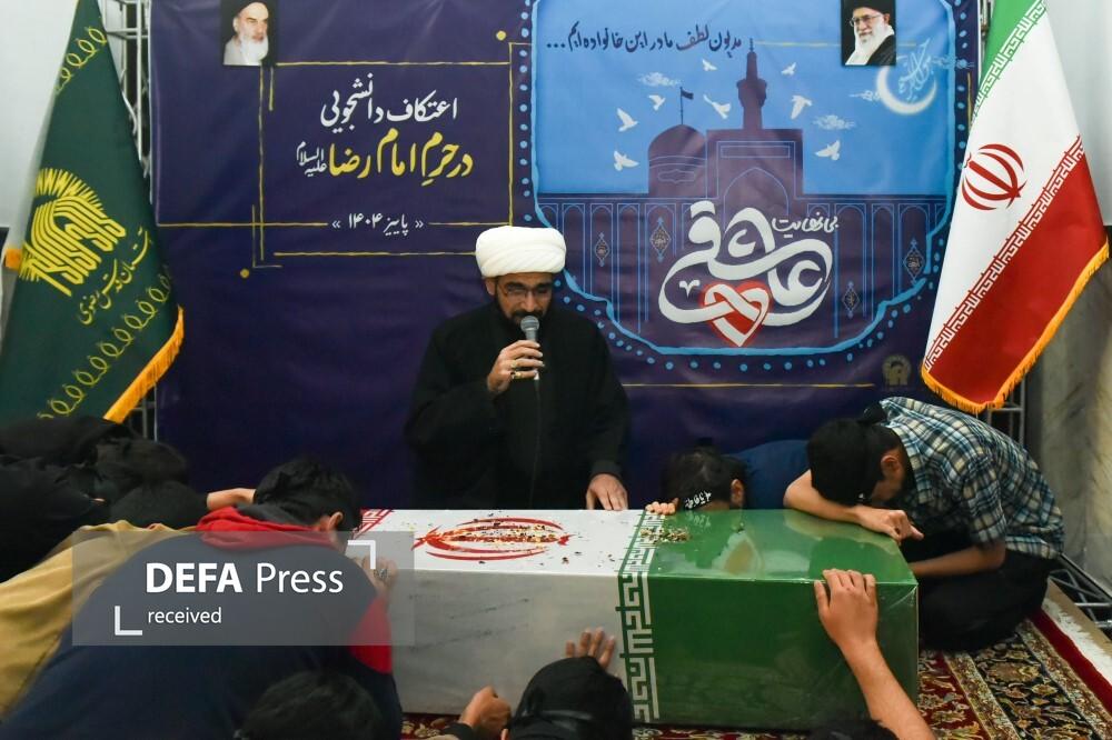معتکفین شرکتکننده در مراسم اعتکاف دانشجویی از سراسر کشور با پیکر مطهر شهید گمنام تک دشمن در جزیره مجنون در شبستان میلانی مسجد گوهرشاد حرم مطهر امام رضا علیهالسلام وداع کردند.