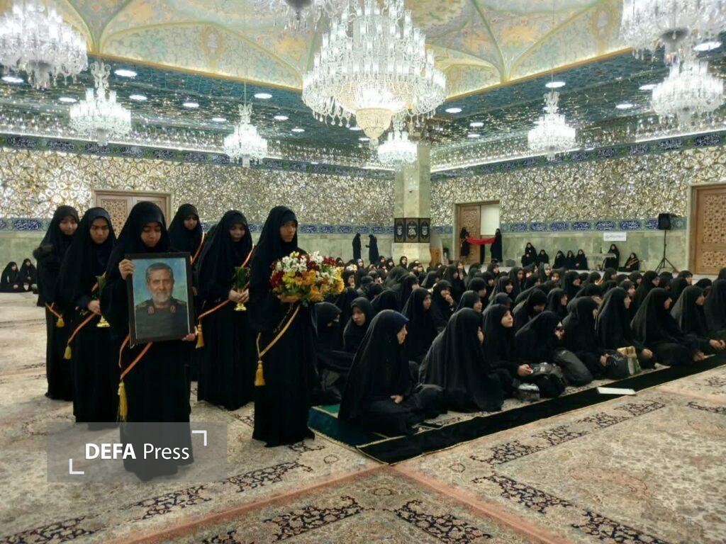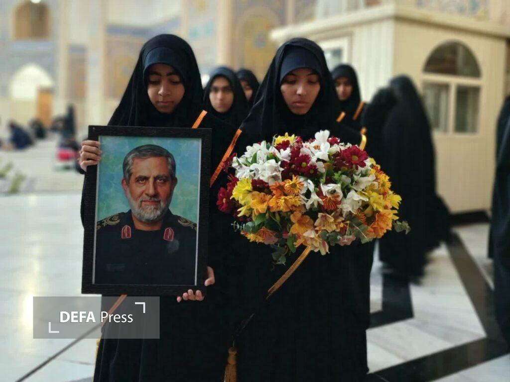 دختران نوجوان عضو هیات معصومانه پس از برگزاری هیات در شبستان حضرت زهرا(س) با حضور همسر سردار شهید محمدسعید ایزدی(حاج رمضان)، به مزار این سردار شهید در صحن امام هادی(ع) ادای احترام کردند.