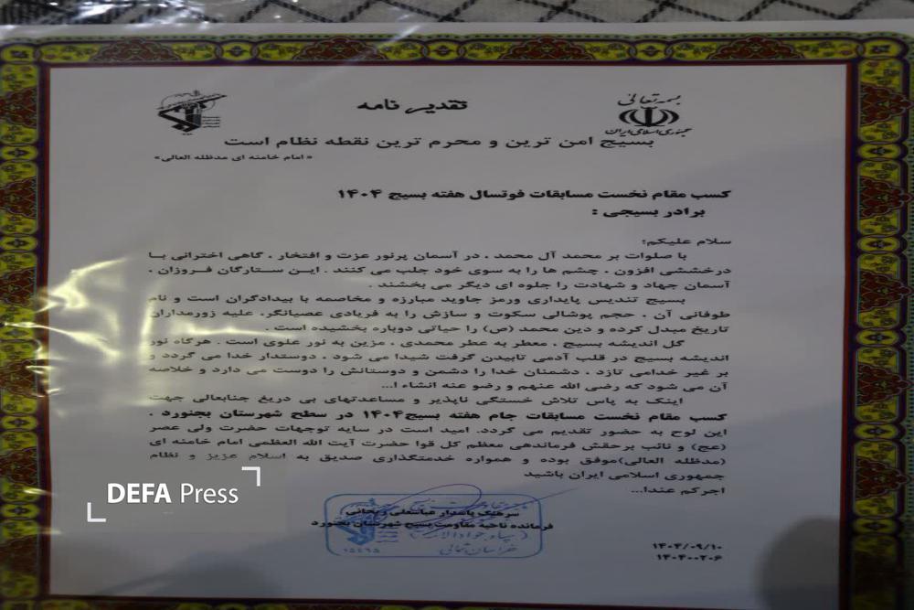 مسابقات فوتسال جام گرامیداشت هفته بسیج در خراسان شمالی برگزار و در پایان مسابقات از سه تیم برتر تقدیر به عمل آمد.