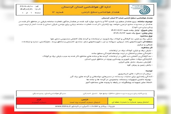 کارشناس هواشناسی استان کردستان ادامه داد: بارشها به صورت باران و برف پیشبینی میشود و در گردنهها و ارتفاعات، کولاک برف همراه با مهگرفتگی رخ خواهد داد که این شرایط کاهش دید افقی را به دنبال دارد.