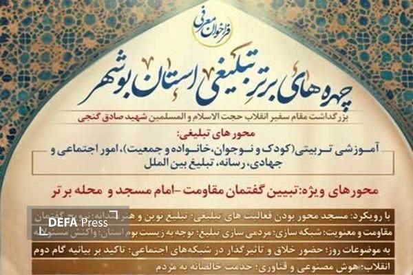 وی در گفت وگو با رسانه ها اظهار داشت: رویداد چهرههای برتر تبلیغی استان بوشهر (شهید گنجی)، کارگاه عملی تحقق منویات رهبری معظم انقلاب (مدظلهالعالی)، آزمونی برای سنجش عیار تبلیغ جهادی و کارزار شناسایی سربازان گمنام جبهه فرهنگی است.