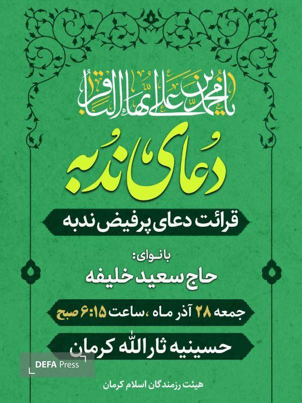 مراسم قرائت دعای پرفیض ندبه صبح جمعه ۲۸ آذرماه در حسینیه ثارالله کرمان با نوای حاج سعید خلیفه برگزار خواهد شد.