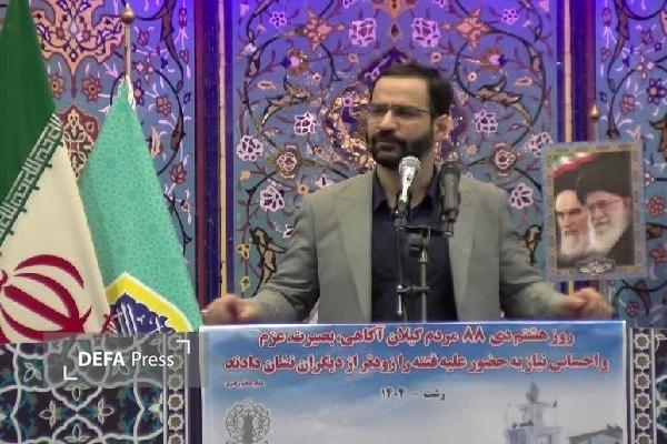 وی با اشاره به خلق حماسه ۹ دی توسط مردم ایران و حماسه ۸ دی توسط گیلانی ها، افزود: بیش از ۱۰۰ سال پیش که روسها و انگلیسیها در کشور ما بودند، مردم گیلان به رهبری میرزا کوچک جنگلی در مقابل دشمنان ایستادند و با استعمار مبارزه کردند. گیلانیها در همه تحولات معاصر ایران نقش داشتند و شهدای گیلان در دوران دفاع مقدس و دفاع از حرم نیز قابل توجه است.