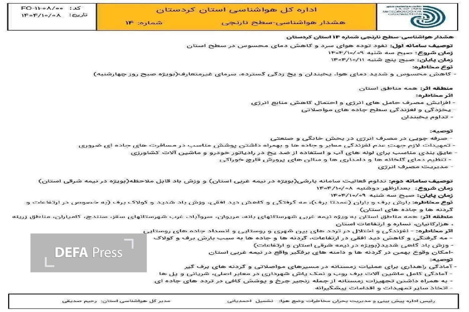 شامگاه دوشنبه مورخ ۱۴۰۴/۱۰/۰۸، بهدنبال بارش سنگین برف در بیشتر مناطق استان کردستان، نشست اضطراری شورای هماهنگی مدیریت بحران استان به ریاست استاندار کردستان، بهمنظور هماهنگی برای عبور از بحران و بهکارگیری امکانات استان در راستای جلوگیری از بروز مشکلات برای مردم، برگزار شد.