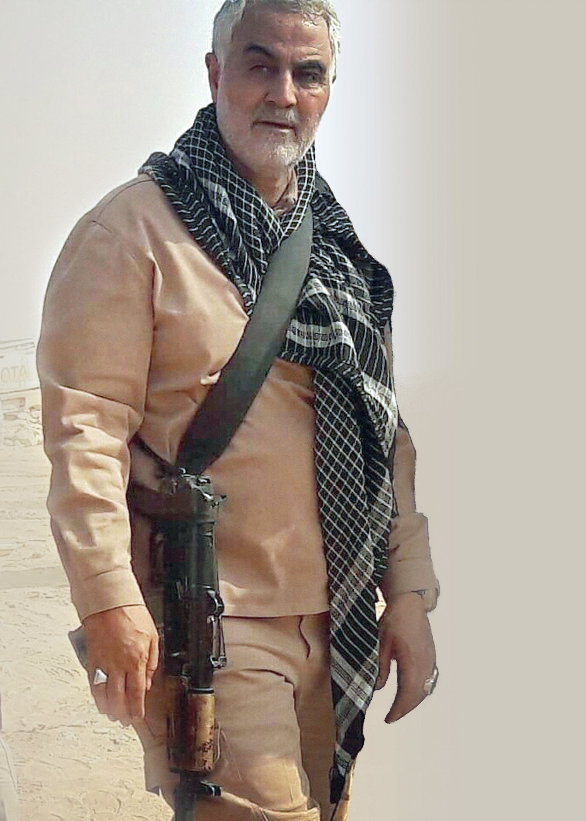 سردار سپهبد شهید حاج «قاسم سلیمانی» متولد سال ۱۳۳۵ در روستای «قنات ملک» استان کرمان، در طول دوران دفاع مقدس، فرماندهی لشکر ۴۱ ثارالله را برعهده داشت و در عملیاتهای زیادی نقش مؤثر ایفا کرد. وی پس از پایان جنگ تحمیلی نیز در راستای تأمین امنیت شرق کشور، تلاشهای زیادی انجام داد، تا اینکه سال ۱۳۷۶ بهعنوان فرمانده نیروی قدس سپاه منصوب شد و دست به احیا و تقویت جبهه مقاومت در منطقه زد و توطئههای استکبار جهانی از جمله فتنه گروه تروریستی داعش را با شکست مواجه ساخت. سرانجام این فرمانده خستگیناپذیر ۱۳ دی سال ۱۳۹۸ توسط ارتش تروریستی آمریکا در فرودگاه بغداد بههمراه جمعی از همرزمانش ترور شد و به شهادت رسید.