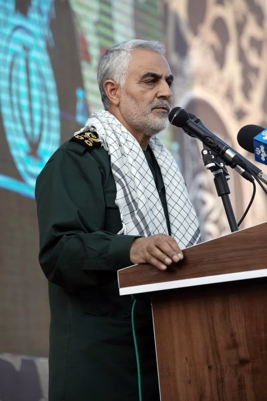 سردار سپهبد شهید حاج «قاسم سلیمانی» متولد سال ۱۳۳۵ در روستای «قنات ملک» استان کرمان، در دوران دفاع مقدس فرماندهی لشکر ۴۱ ثارالله را برعهده داشت و پس از پایان جنگ تحمیلی نیز در راستای تأمین امنیت شرق کشور، تلاشهای زیادی انجام داد، تا اینکه سال ۱۳۷۶ بهعنوان فرمانده نیروی قدس سپاه منصوب شد و دست به احیا و تقویت جبهه مقاومت در منطقه زد و سرانجام ۱۳ دی سال ۱۳۹۸ توسط ارتش تروریستی آمریکا در فرودگاه بغداد به شهادت رسید.