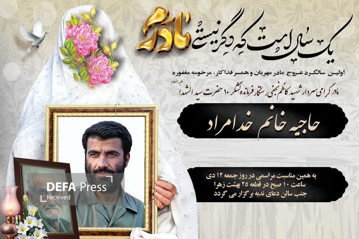 به گزارش خبرنگار حماسه و جهاد دفاع‌پرس، مراسم اولین سالگرد درگذشت حاجیه خانم «خدامراد» مادر بزرگوار سردار شهید کاظم نجفی رستگار فرمانده فقید لشکر ۱۰ حضرت سیدالشهدا علیه السلام در دوران دفاع مقدس صبح جمعه ۱۲ دی ماه از ساعت ۱۰ صبح در قطعه ۲۵ گلزار شهدای بهشت زهرای تهران جنب سالن دعای ندبه برگزار خواهد شد.