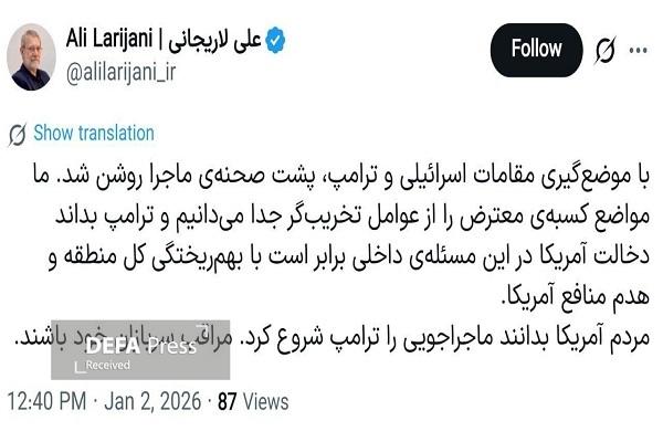 به گزارش گروه سیاسی دفاعپرس، «علی لاریجانی» دبیر شورای عالی امنیت ملی در حساب کاربری خود در شبکه اجتماعی ایکس نوشت: با موضعگیری مقامات اسرائیلی و ترامپ، پشت صحنهی ماجرا روشن شد. ما مواضع کسبهی معترض را از عوامل تخریبگر جدا میدانیم و ترامپ بداند دخالت آمریکا در این مسئلهی داخلی برابر است با بهمریختگی کل منطقه و هم منافع آمریکا. مردم آمریکا بدانند ماجراجویی را ترامپ شروع کرد. مراقب سربازان خود باشند.