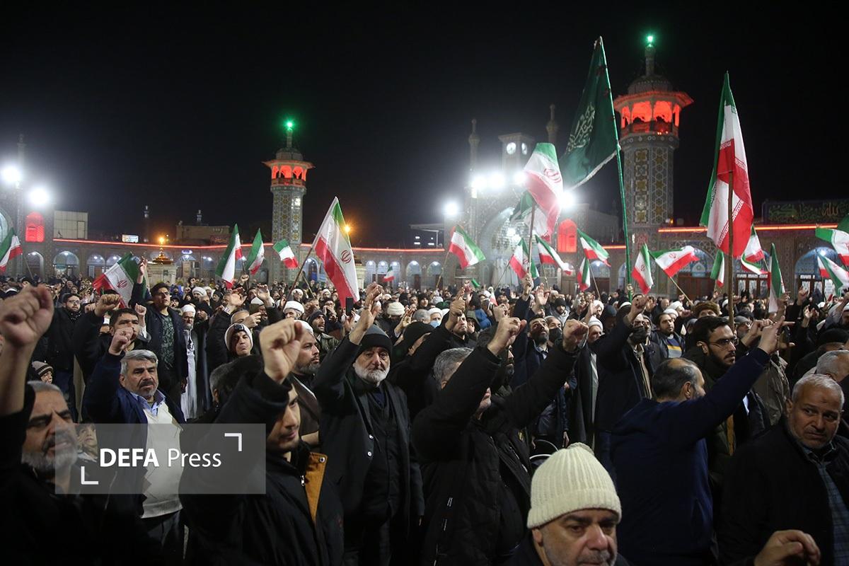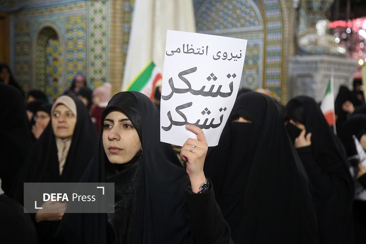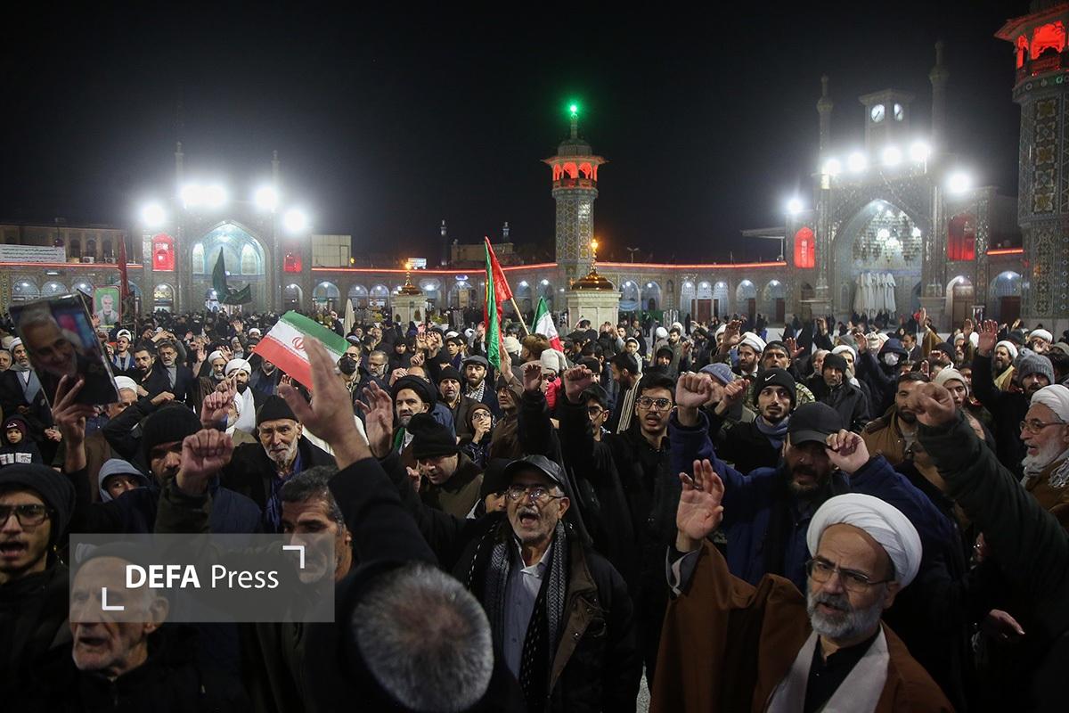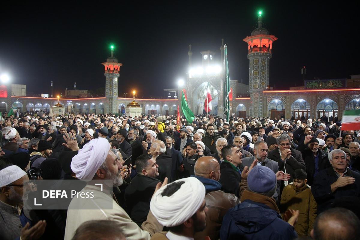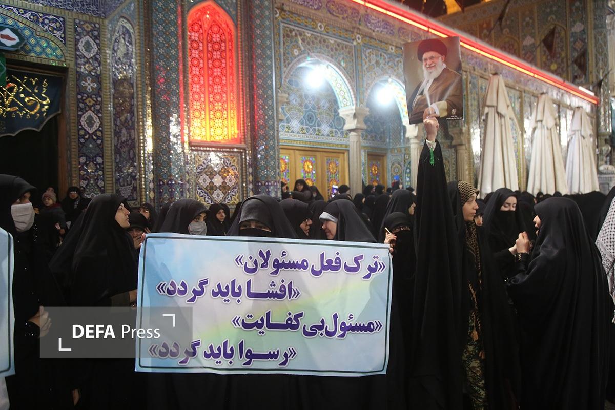 مردم انقلابی و همیشه در صحنه قم با همراهی هیئتهای مذهبی همزمان با شام رحلت حضرت زینب کبری(س) با اجتماع در صحن امام رضا(ع) حرم مطهر حضرت فاطمه معصومه(س) انزجار خود را از اقدامات شوم اغتشاش گران اعلام کردند.