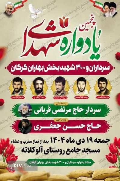 پنجمین یادواره ۳۰۰ شهید بخش بهاران استان گلستان جمعه ۱۴۰۴/۱۰/۱۹ مسجد جامع روستای آلوکلاته برگزاری می گردد.