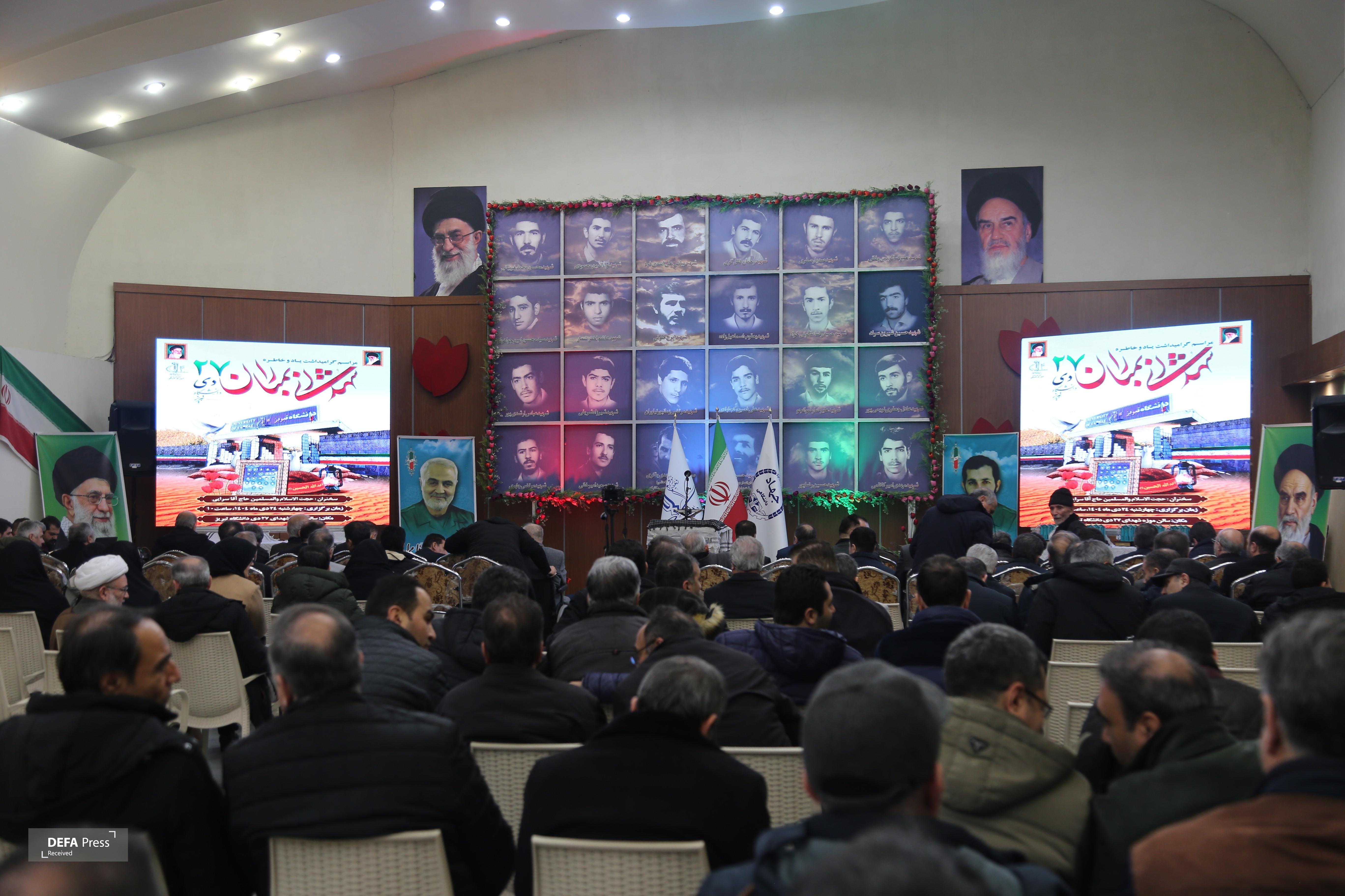 مراسم گرامیداشت یاد و خاطره شهدای بمباران شهدای ۲۷ دی دانشگاه تبریز با حضور خانوادههای معظم شهداء، ایثارگران، مسئولین و مدیران استانی و همچنین اساتید و کارکنان دانشگاه تبریز امروز چهارشنبه ۲۴ دی ماه ساعت ۱۰ صبح در موزه شهدای دانشگاه برگزار شد.