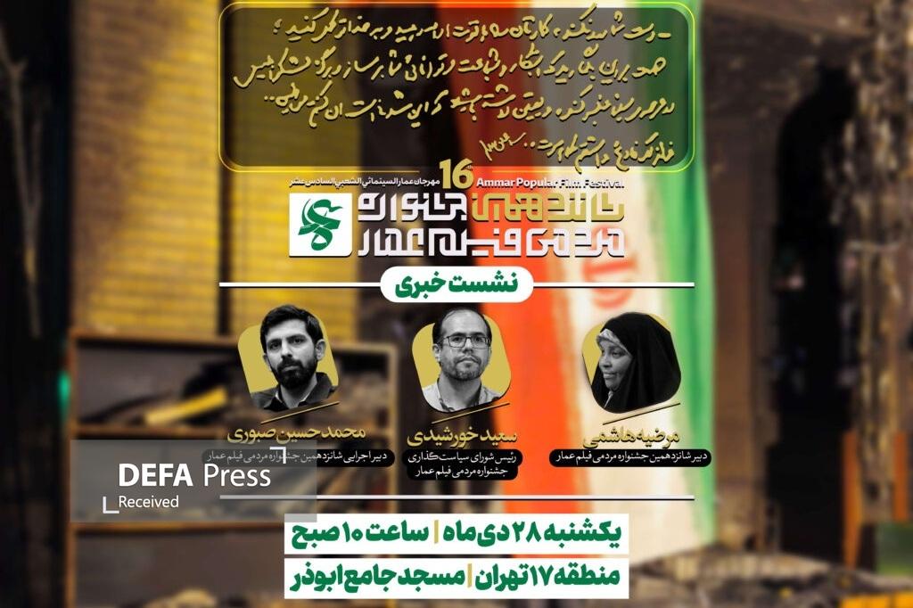 در این نشست که با هدف اعلام جزئیات برنامه‌های افتتاحیه، اختتامیه و اعلام نمایش مرکزی آثار شانزدهمین جشنواره مردمی فیلم عمار برگزار می‌شود، مرضیه هاشمی دبیر جشنواره، سعید خورشیدی رئیس شورای سیاستگذاری و محمدحسین صبوری دبیر اجرایی جشنواره حضور خواهند داشت.