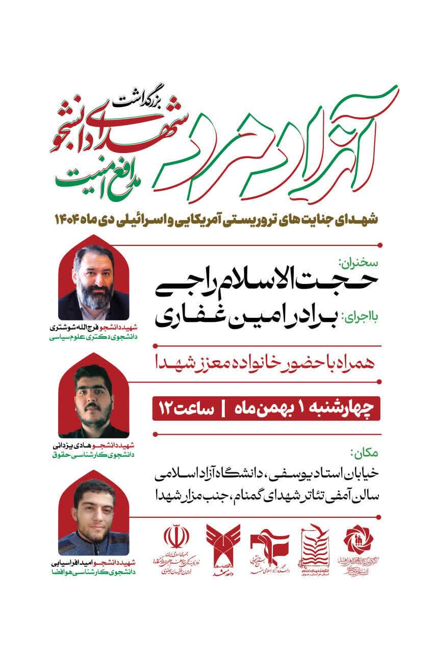 یادواره شهدای دانشجوی مدافع امنیت دانشگاه آزاد اسلامی مشهد، تحت عنوان «آزادمرد»، در سالن اجتماعات شهدای گمنام این دانشگاه برگزار خواهد شد.