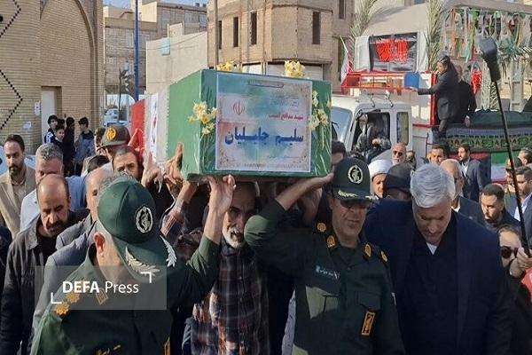 به گزارش دفاعپرس از خوزستان، پیکر شهید مدافع امنیت «سلیم جلیلیان» که توسط تروریستهای مسلح در اغتشاشات اخیر به شهادت رسیده بود امروز (دوشنبه) با حضور مردم ولایتمدار، انقلابی و شهیدپرور خرمشهر از مقابل مسجد جامع خرمشهر تشییع و پیکر مطهر این شهید پس از اقامه نماز در قطعه شهدا گلزار شهدای خرمشهر به خاک سپرده شد.