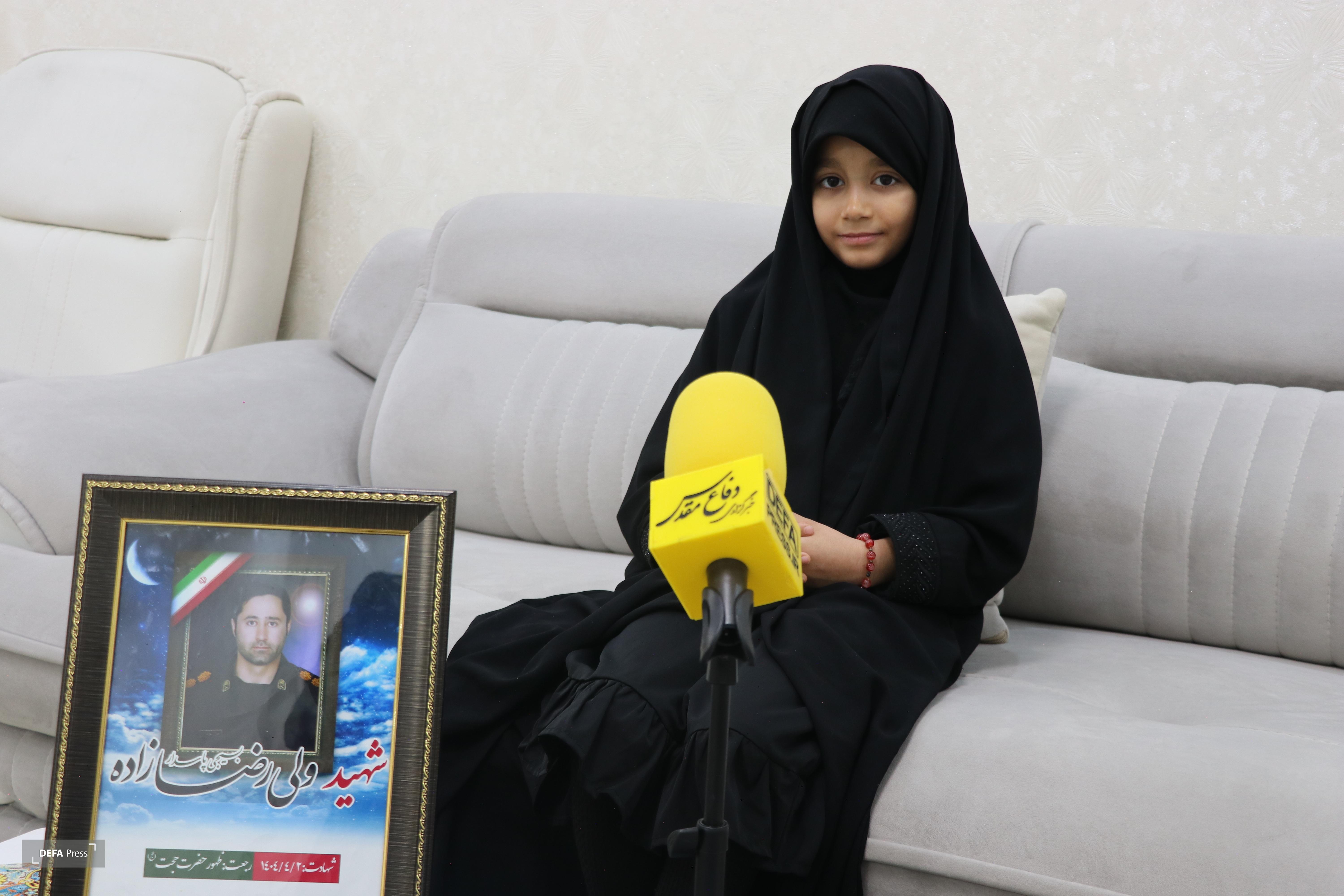 «حلما رضازاده»، فرزند شهید مدافع وطن ولی رضازاده که در جنگ۱۲ روزه توسط رژیم صهیونیستی به شهادت رسید، در گفتوگویی ویژه با خبرگزاری دفاعپرس با اشاره به افتخار فرزند شهید بودن، اظهار داشت: بسیار خوشحالم که فرزند شهید هستم و به این عنوان افتخار میکنم، چراکه پدرم به آرزوی دیرینهاش که شهادت در راه دفاع از وطن بود، دست یافت.