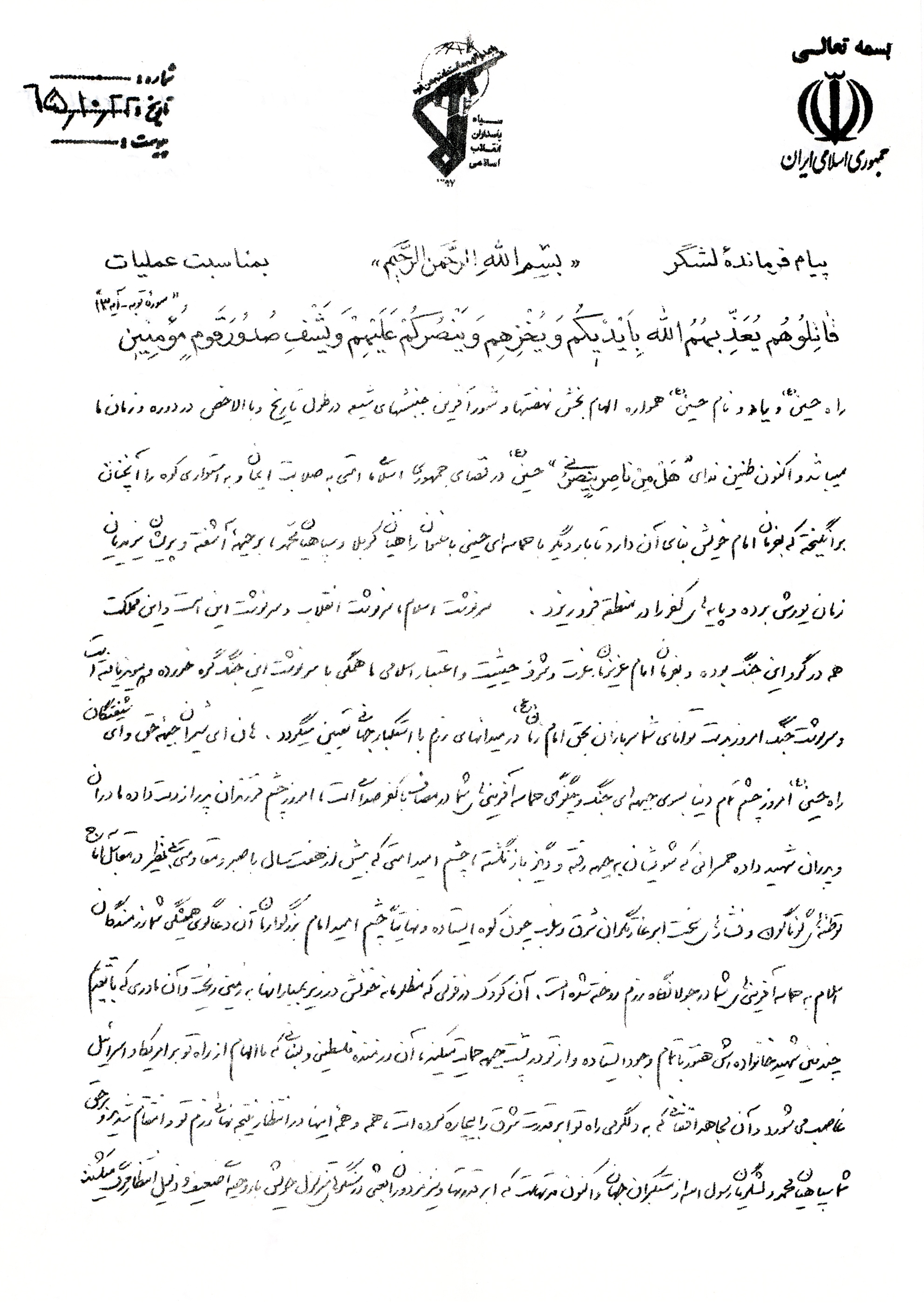 هان! ای عزیز، ای شیر جبهه حق، ای منتقم خون حسین (ع)؛ آیا مسئولیت عظیمی که امروز برگُردهات سنگینی میکند، احساس میکنی؟ و آن را با تمام وجود لمس مینمایی؟ حتما میدانی که ادای همه این مسئولیتهای شرعی و القای همه این تکالیف الهی، همه و همه در گرو این عملیات سنگین و سرنوشتساز است؛ و تو ای رزمنده بزرگوار و با صلابت! همانی هستی که به لطف خدا و قوت ایمانت در جبهههای «فاو» و «مهران» حماسه آفریدی و یکپارچه بر دشمن تاختی و زمین و زمان را بر آنان تنگ نمودی و به اسارت و مرگشان کشاندی و اکنون امروز نوبت رزمی دیگر است و گاه نبرد و حماسهای عظیمتر و سنگینتر؛ چراکه هنوز صدای هل من ناصر حسین (ع) از درون صحن و سرای غریب خلوتش، در فضا طنین میافکند و خونخواهانش را برای انتقام و مظلومیت خویش و اهلبیتش در صحرای کربلا و واقعه عاشورا میطلبد و نیز شما خوب میدانید که پیروزی از آن خداست و بهدست اوست که و «من النصر الا من عندالله العزیز الحکیم»؛ و نیک میدانید که همه ما برای انجام تکلیف شرعی و حکم امام و ولیفقیهمان میجنگیم و همه میدانیم که تمام ساز و برگ و کید و مکر دشمن، در مقابل خواست و اراده لایزال الهی ناچیز است و بی اثر که «لا حول و لا قوة الا بالله العلی العظیم».