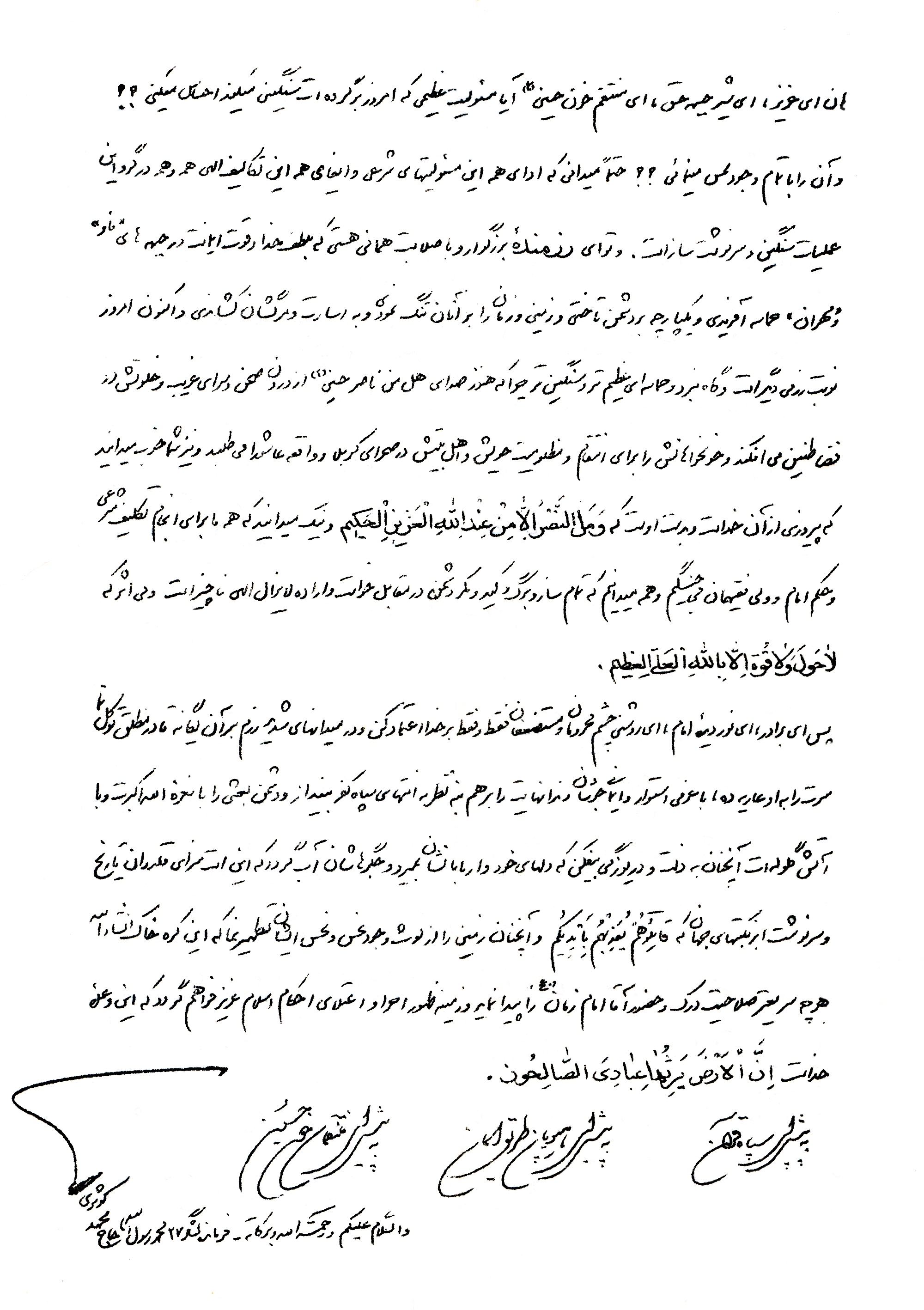 پس ای برادر، ای نور دیده امام، ای روشنی چشم محرومان و مستضعفان! فقط و فقط بر خدا اعتماد کن و در میدانهای شدید رزم بر آن یگانه قادر مطلق توکل نما، سرت را به او عاریه ده، با عزمی استوار و ایمانی جوشان، دندانهایت را برهم بنه، نظر به انتهای سپاه کفر بیانداز و دشمن بعثی را با نعره الله اکبرت و با آتش گلولهات آنچنان به ذلت و دریوزگی بیفکن که دلهای خود و اربابانشان بمیرد و جگرهاشان آب گردد که این است سزای قلدران تاریخ و سرنوشت اَبرنکبتهای جهان که «قائلوهم یعذبهم بایدیکم»؛ و آنچنان زمین را از لوث وجود نحس و نجس ایشان تطهیر نما که این کره خاک انشاءالله هرچه سریعتر صلاحیت درک و حضور آقا امام زمان (عج) را پیدا نماید و زمینه ظهور اجرا و اعتلای احکام اسلام فراهم گردد که این وعده خداست «إن الأرض یرثها عِبَادِی الصَّالِحُون».