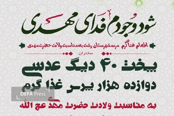 عیسی زارع نماینده ستاد مردمی گرامیداشت اعیاد نیمه شعبان شهر رشت در این باره گفت: این اقدام معنوی با تلاش گروههای مردمی و هیئات مذهبی در رشت صورت گرفته است تا در ایام میلاد امام زمان (عج) که نماد امید و امیدآفرینی است بتوانیم بخشی از نیازهای اجتماعی را برطرف کنیم. توزیع این ۱۲ هزار پرس غذا، در روز ۱۴ بهمن ماه انجام شده و در مناطق مختلف شهر رشت به دست نیازمندان خواهد رسید.