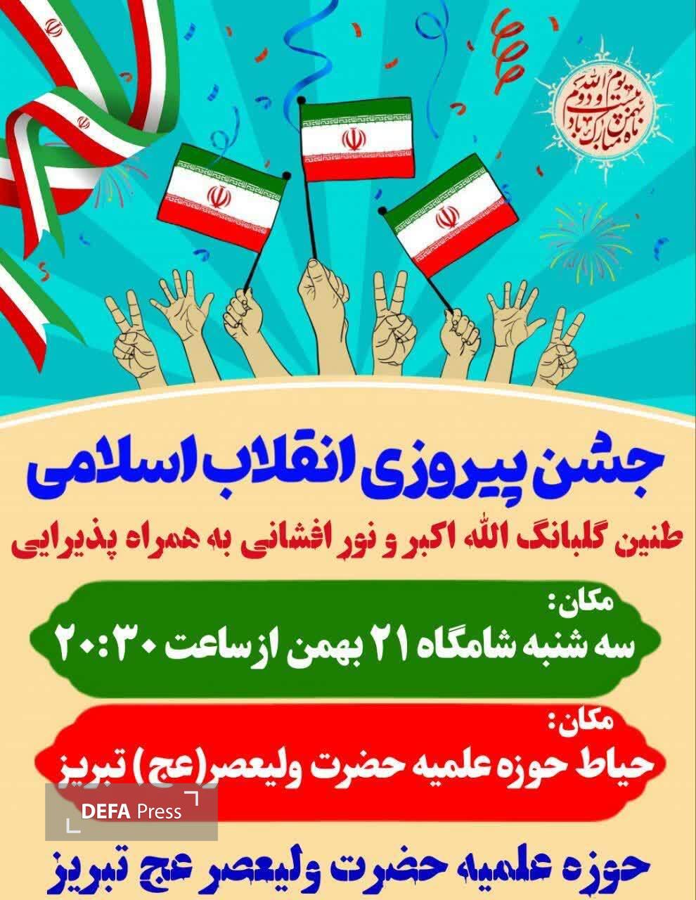 به گزارش خبرنگار دفاعپرس از آذربایجان شرقی، جشن بزرگ پیروزی انقلاب اسلامی و طنین گلبانگ الله اکبر همزمان با ندای امت حزب الله و امت عزیز ایران اسلامی و برنامه نورافشانی به همراه پذیرایی سه شنبه شامگاه ۲۱ بهمن ماه ساعت ۲۰:۴۵ در حیاط حوزه علمیه حضرت ولیعصر عجل الله تعالی فرجه الشریف تبریز برگزار خواهد شد.