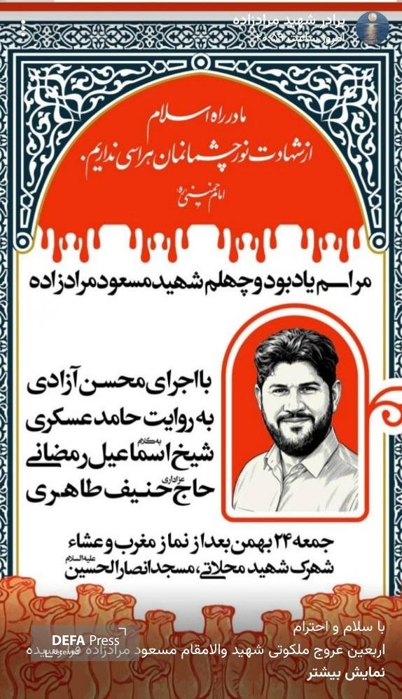 مراسم یادبود چهلمین روز شهادت شهید مسعود مرادزاده از شهدای اغتشاشات تروریستی دی ماه در مسجد انصارالحسین علیهالسلام شهرک شهید محلاتی برگزار میشود.