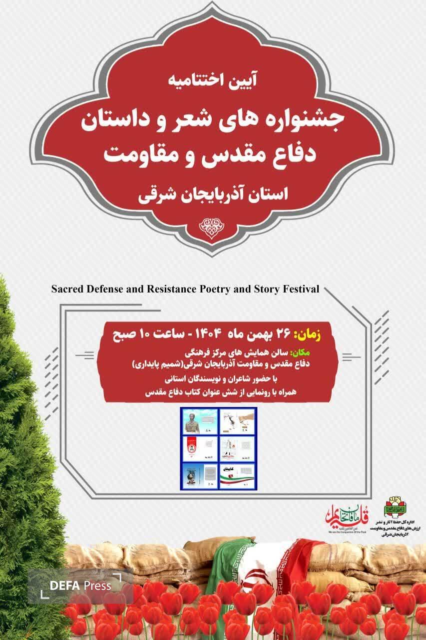 آئین اختتامیه استانی جشنواره شعر و داستان دفاع مقدس و مقاومت آذربایجانشرقی با معرفی برگزیدگان و رونمایی از تازههای نشر اداره کل حفظ آثار و نشر ارزشهای دفاع مقدس برگزار میشود.