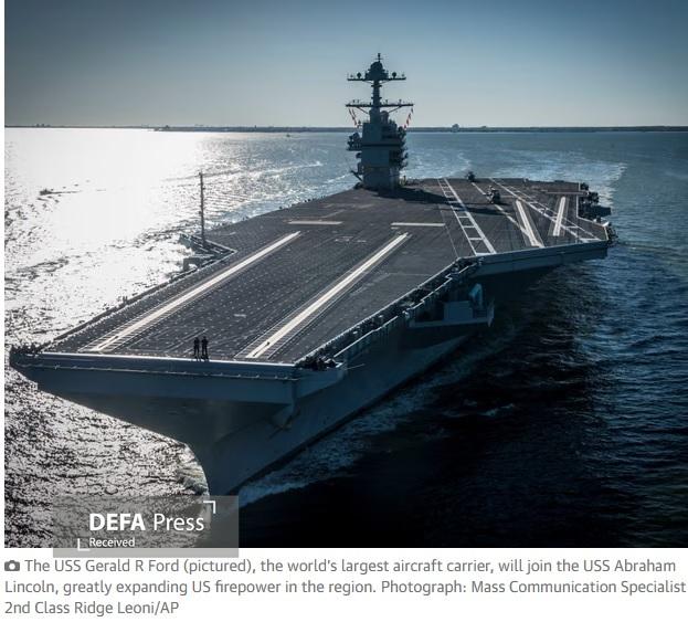 ناو هواپیمابر «جرالد آر فورد» به عنوان بزرگترین ناو هواپیمابر آمریکا به ناو هواپیمابر «آبراهام لینکلن» به منظور افزایش قدرت آتش ارتش آمریکا ملحق می شود (منبع: روزنامه «گاردین»)