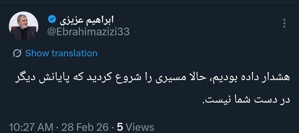 به گزارش گروه سیاسی دفاع‌پرس، ابراهیم عزیزی رئیس کمیسیون امنیت ملی مجلس شورای اسلامی در پیامی در شبکه اجتماعی ایکس با اشاره به تجاوز رژیم رژیم صهیونیستی به کشور گفت: هشدار داده بودیم، حالا مسیری را شروع کردید که پایانش دیگر در دست شما نیست.