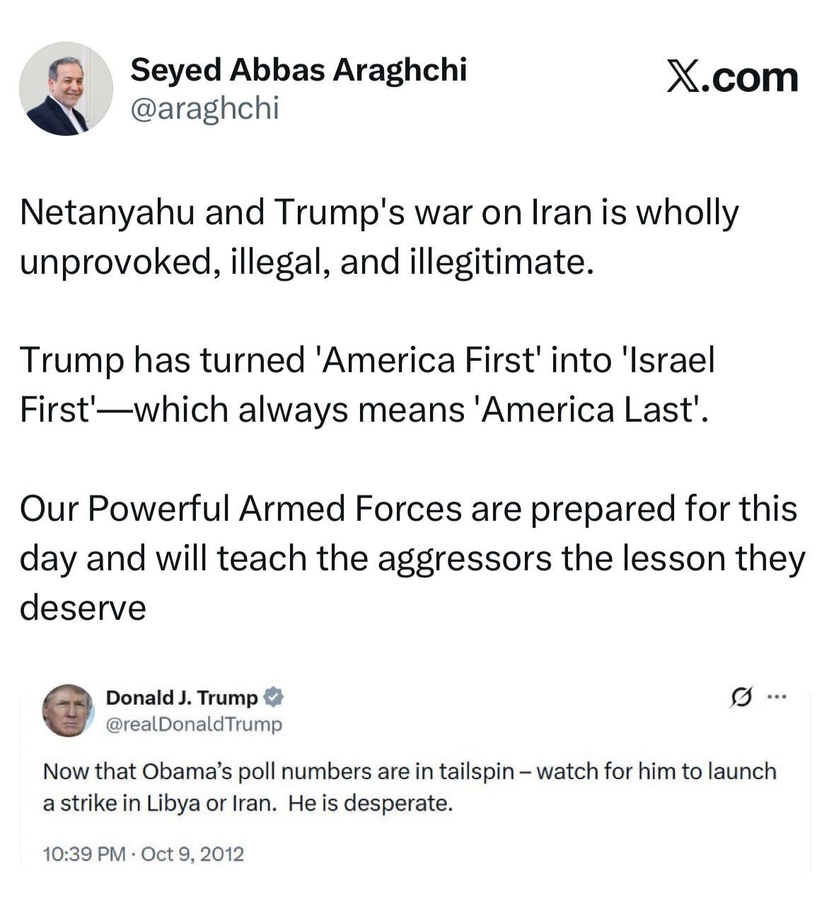 به گزارش گروه بین‌الملل دفاع‌پرس، «عباس عراقچی» وزیر امور خارجۀ ایران با یادآوری تصویری از توئیت ترامپ در سال ۲۰۱۲ که نوشته بود «حالا که محبوبیت اوباما به‌شدت در حال سقوط است، منتظر باشید که او حمله‌ای به لیبی یا ایران انجام دهد» نوشت: جنگ نتانیاهو و ترامپ علیه ایران کاملاً بی‌دلیل، غیرقانونی و نامشروع است.