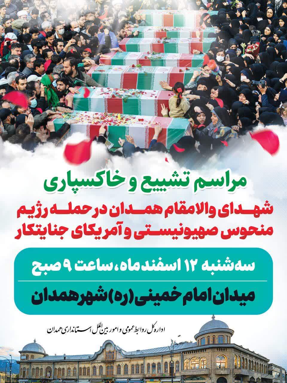 پیکرهای مطهر شهدای حمله اخیر رژیم صهیونیستی فردا (سهشنبه) در همدان تشییع و به خاک سپرده خواهند شد. این مراسم با حضور مردم و مسئولین در میدان امام خمینی (ره) برگزار میشود.