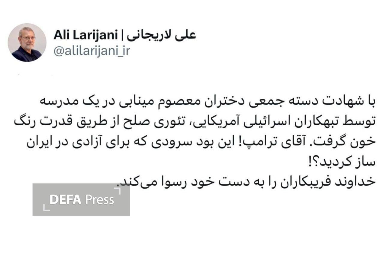 به گزارش گروه سیاسی دفاعپرس، علی لاریجانی دبیر شورای عالی امنیت ملی در شبکه اجتماعی نوشت: با شهادت دسته جمعی دختران معصوم مینابی در یک مدرسه توسط تبهکاران اسرائیلی آمریکایی، تئوری صلح از طریق قدرت رنگ خون گرفت.