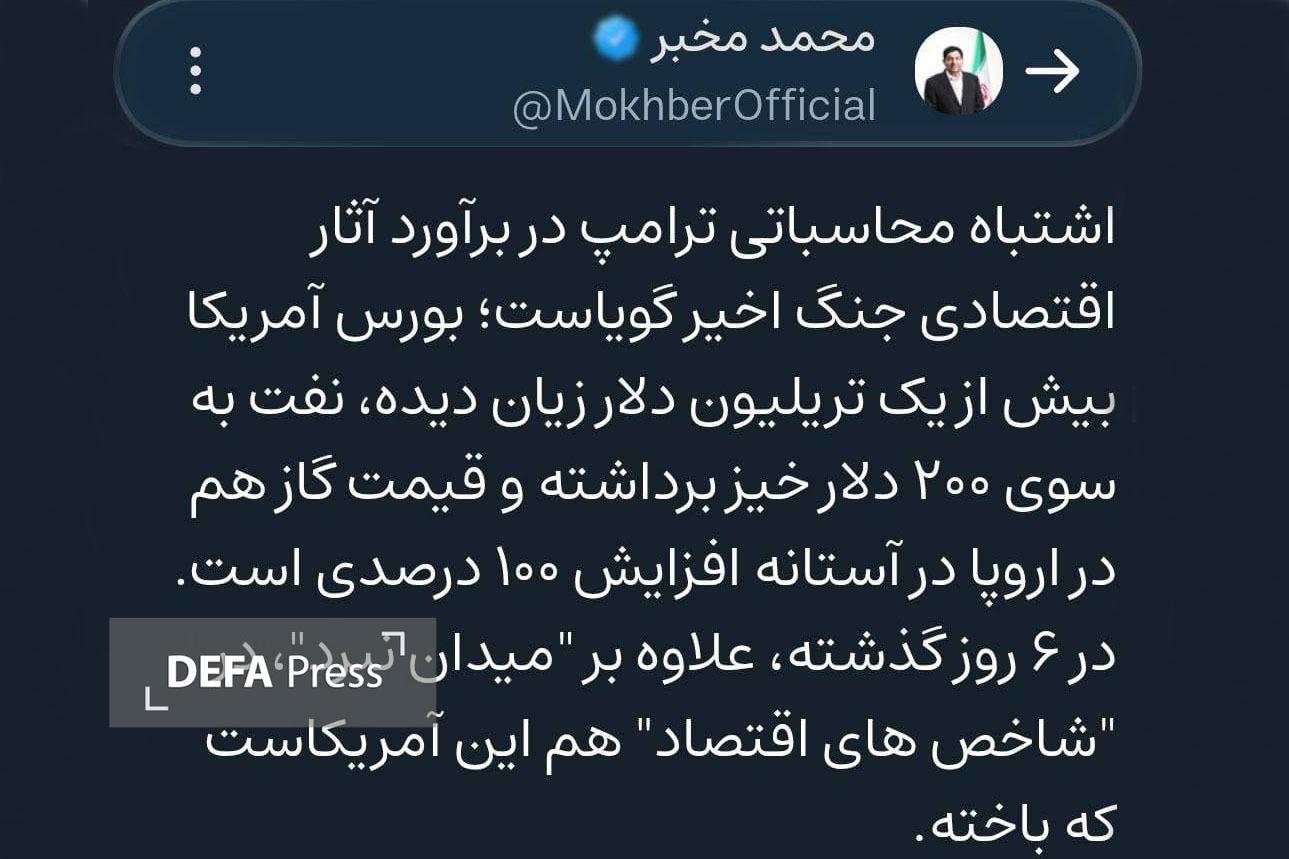 به گزارش گروه سیاسی دفاعپرس، محمد مخبر مشاور و دستیار رهبر شهید انقلاب اسلامی در صفحه مجازی خود نوشت: اشتباه محاسباتی ترامپ در برآورد آثار اقتصادی جنگ اخیر گویاست؛ بورس آمریکا بیش از یک تریلیون دلار زیان دیده، نفت به سوی ۲۰۰ دلار خیز برداشته و قیمت گاز هم در اروپا در آستانه افزایش ۱۰۰ درصدی است. در ۶ روز گذشته، علاوه بر «میدان نبرد»، در «شاخصهای اقتصاد» هم این آمریکاست که باخته.