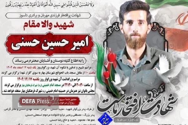 پیکر شهید والامقام «امیرحسین حسنی» که در حملات آمریکا و رژیم صهیونیستی به فیض عظیم شهادت نائل آمد، روز (یکشنبه) ۱۷ اسفند ماه در شهرستان بهار تشییع و تدفین خواهد شد.