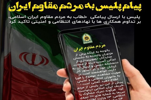 به گزارش گروه جامعه دفاع‌پرس، فرماندهی انتظامی جمهوری اسلامی با ارسال پیامکی از طریق تلفن همراه خطاب به مردم مقاوم ایران اسلامی، بر تداوم همکاری‌ها با نهاد‌های انتظامی و امنیتی تاکید کرد و خواستار گزارش هرگونه تصویربرداری از اماکن آسیب دیده از جنگ به ماموران انتظامی و امنیتی شد.