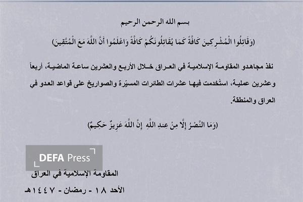 مقاومت عراق اعلام کرد که طی یک شبانه روز پایگاه آمریکا در عراق و منطقه را ۲۴ بار هدف قرار داده است.
