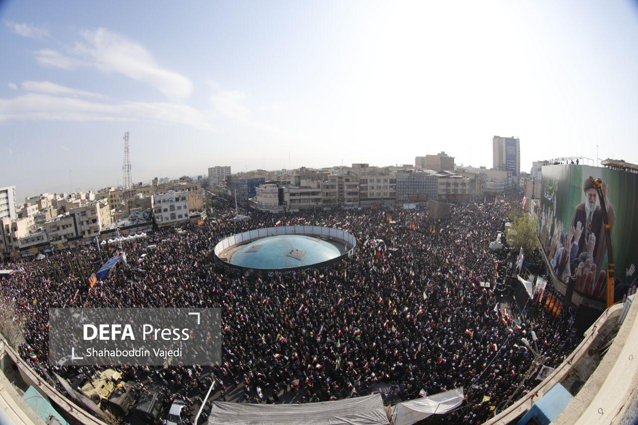 شعارهایی از جمله «الله اکبر؛ خامنهای رهبر»، «دست خدا بر سر ما؛ خامنهای رهبر ما» در فضای مراسم طنینانداز شده است.