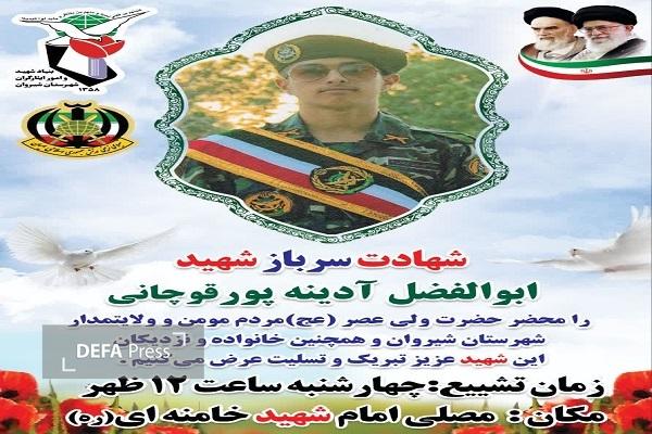 آیین باشکوه تشییع پیکر مطهر شهید والامقام سرباز شهید «ابوالفضل آدینه پورقوچانی»در شهرستان شیروان برگزار می شود.