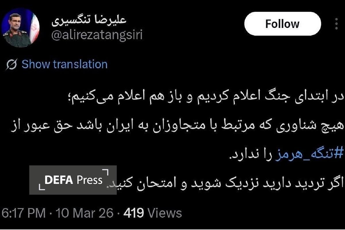 به گزارش گروه دفاعی امنیتی دفاعپرس، دریادار علیرضا تنگسیری فرمانده نیروی دریایی سپاه در توئیتی در شبکه اجتماعی ایکس تاکید کرد: در ابتدای جنگ اعلام کردیم و باز هم اعلام میکنیم هیچ شناوری که مرتبط با متجاوزان به ایران باشد، حق عبور از تنگه هرمز را ندارد.