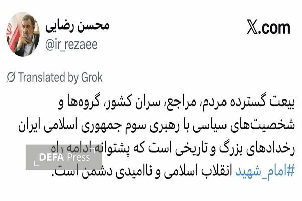 به گزارش خبرنگار دفاعی امنیتی دفاعپرس، سرلشکر «محسن رضایی» فرمانده کل سپاه در دوران دفاع مقدس اظهار داشت: بیعت گسترده مردم، مراجع، سران کشورها، گروهها و شخصیتهای سیاسی با رهبری سوم جمهوری اسلامی ایران رخداد بزرگ و تاریخی است که پشتوانه راه امام شهید انقلاب اسلامی و ناامیدی دشمن است.