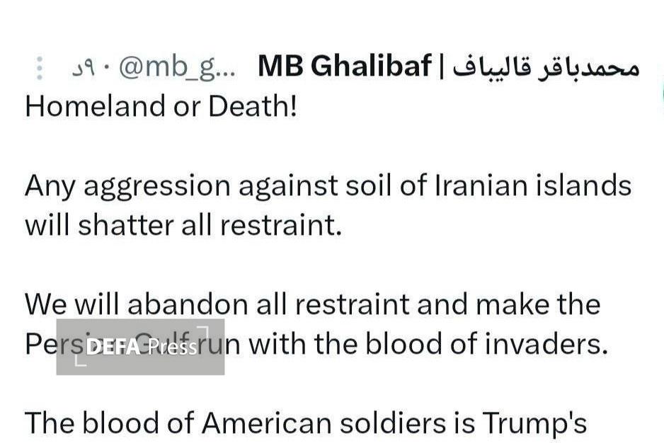 به گزارش گروه سیاسی دفاعپرس، محمدباقر قالیباف رئیس مجلس شورای اسلامی در شبکه اجتماعی ایکس نوشت: با هرگونه تعدی به خاک جزایر ایرانی، خون اشغالگران را میریزیم.