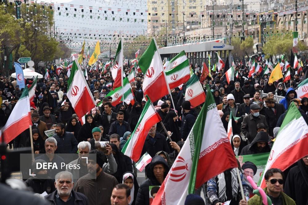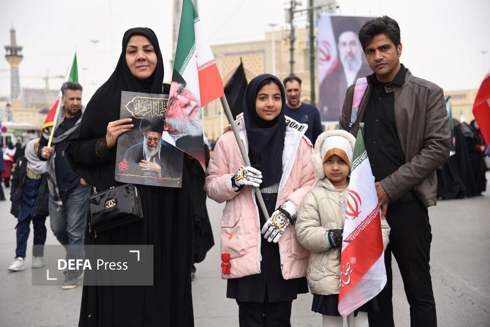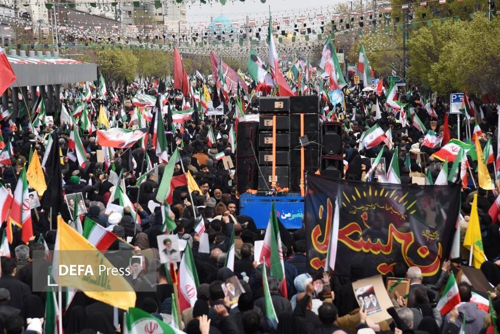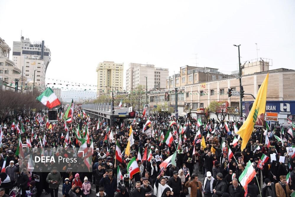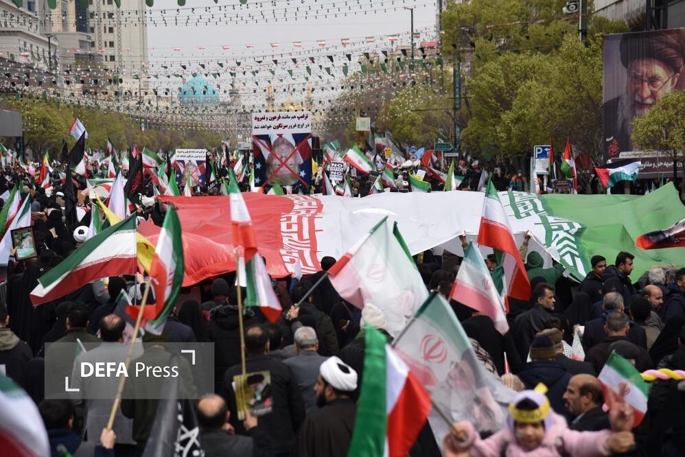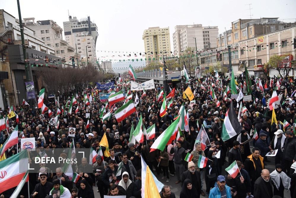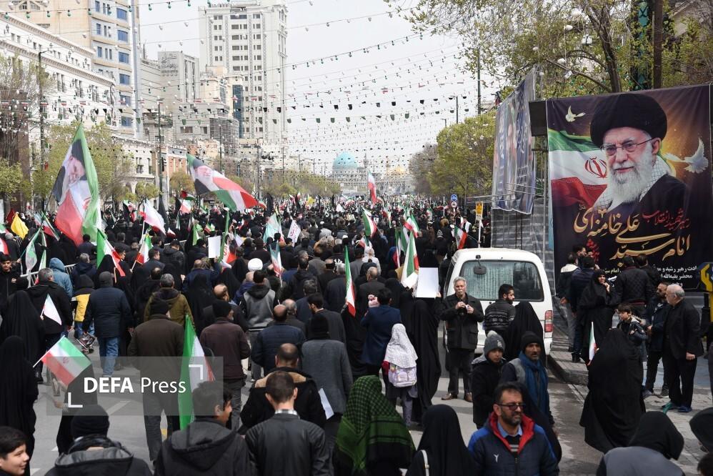 مردم مشهد و زائران حریم مطهر امام هشتم همزمان با سراسر کشور با حضور گسترده در راهپیمایی روز جهانی قدس، ضمن بیعت با سومین رهبر انقلاب و اعلام حمایت خود از ملت مظلوم فلسطین؛ فریاد انتقامخواهی رهبر شهید امت؛ حضرت آیتالله العظمی خامنهای از رژیم صهیونی و ایالات متحده آمریکا را فریاد زدند.