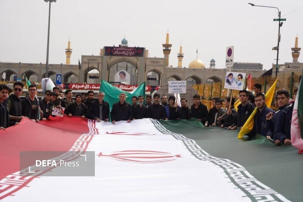 مردم روزه‌دار و انقلابی مشهدالرضا (ع) در راهپیمایی روز جهانی قدس؛ بار دیگر با حضور گسترده در خیابان‌های منتهی به حرم امام رضا (ع)، حمایت خود را از قدس شریف اعلام و جنایات آمریکا و رژیم صهیونیستی علیه کودکان و دانش‌آموزان بی‌گناه را در ایران و فلسطین محکوم کردند.