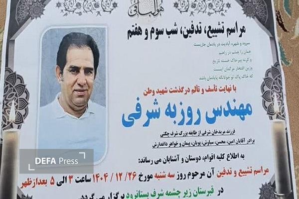 مراسم خاکسپاری شهید «روزبه شرفی» که امروز در حمله هوایی دشمن صهیونیستی - آمریکایی به شهادت رسید، فردا سهشنبه رأس ساعت ۱۵ تا ۱۷ در قبرستان روستای «زیر چشمه بستانرود» برگزار میشود.