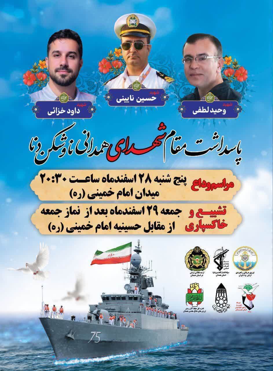 مراسم وداع و تشییع شهدای استان همدان در ناو دنا، شهیدان «حسین نائینی»، «وحید لطفیندائی» و «داود خزایی» در همدان برگزار میشود.