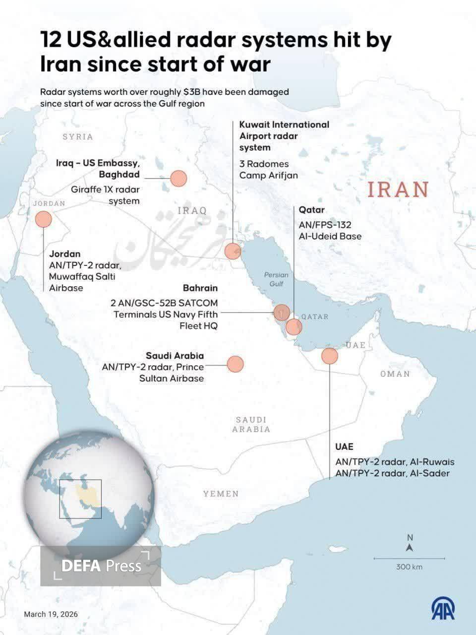 علاوه بر این، گزارشها حاکی از آسیب جدی یا انهدام کامل سامانههای راداری AN/TPY-۲ است. این رادارها که به عنوان قلب تپنده سامانه پدافندی تاد (THAAD) شناخته میشوند، در پایگاههایی نظیر شاهزاده سلطان در عربستان و الظفره در امارات مستقر بودند. انآر جنزن-جونز کارشناس مسائل نظامی در گفتوگو با شبکه سیانان در این زمینه میگوید: از کار افتادن حتی یک دستگاه از این رادارها، ضربهای عملیاتی و سنگین محسوب میشود که جایگزینی آن زمانبر و هزینهبر است.