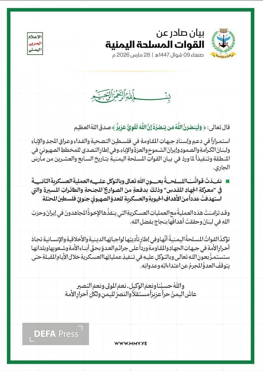 سخنگوی نیروهای مسلح یمن گفت: نیروهای مسلح ما به یاری خداوند متعال و توکل بر او، عملیات نظامی دوم در «نبرد جهاد مقدس» را با یک دسته از موشکهای کروز و پهپادها انجام دادند.